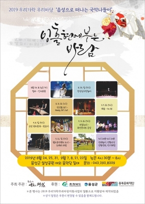 이번 행사는 충북문화재단 공모사업인 “2019 우리가락 우리마당”에 선정된 ‘국악놀이터the 채움’과 업무협약을 체결해 ‘음성으로 떠나는 국악나들이 잉홀현에 부는 바람’ 이라는 주제로 우리가락과 소리를 군민들과 관광객들에게 전해줄 계획이다.