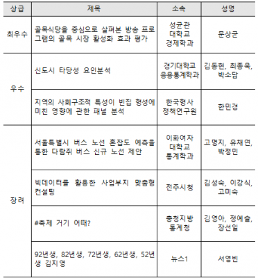 제출된 보고서 중 주제의 참신성, 데이터 활용성, 분석 수준 등을 고려하여 전문가 심사위원회에서 최종 7편의 수상작을 선정했고, 세부내용은 붙임과 같다.