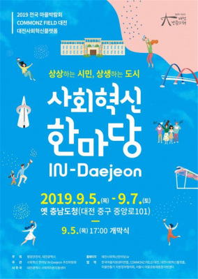[충청뉴스큐] 대전시가 주최하고 2019 사회혁신한마당 추진위원회 및 대전시 사회적자본지원센터가 주관하는 ‘2019 사회혁신 한마당 IN-Daejeon’이 오는 9월 5일부터 7일까지 옛 충남도청 일원에서 개최된다.