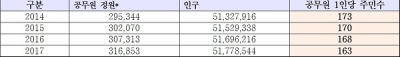 지난 2014년 공무원 정원은 29만 5,344명으로 공무원 1인당 173명의 주민을 담당했던 반면 2017년에는 31만 6,853명으로 공무원 1인당 주민 수는 163명인 것으로 나타났다.