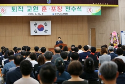 [충청뉴스큐] 전라남도교육청이 28일 오전 청사 2층 대회의실에서 2019년 8월말 퇴직교원 훈·포장 전수식을 개최했다.