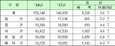 지역별 부과액으로는 유성구가 541억 원, 서구가 434억 원, 대덕구가 202억 원, 중구가 194억 원, 동구가 180억 원 순으로 나타났다.