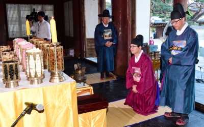[충청뉴스큐] 수원시가 수원 화령전의 운한각·복도각·이안청 국가지정문화재 보물 지정을 기념해 지난 29일 운한각에서 고유제를 지내고 축하연희를 열었다.