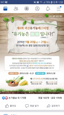 군은 작성된 댓글 중 유기농을 잘 표현하고 괴산군의 유기농업정책에 부합하는 단어를 남긴 참가자를 선정, 괴산 농부들이 정성껏 재배한 총 100만원 상당의 친환경농산물을 경품으로 증정한다.