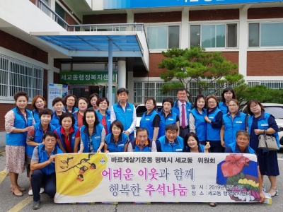 한편 바르게살기 세교동위원회는 매년 주변의 소외된 이웃들에게 따뜻한 마음을 전하기 위해 이웃돕기 바자회, 홀몸노인 은빛 나들이, 미용봉사, 생필품 전달, 사회복지시설 자원봉사 등 활발한 활동을 이어가고 있다.