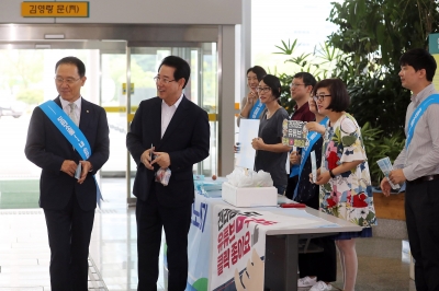 행사에 나선 대변인실과 도민행복소통실 직원들은 ‘홍보가 있어야 정책이 산다’라는 캐치프레이즈를 들고, 출근하는 동료들에게 SNS 가입 안내 리플릿과 간단한 간식을 전달하며 SNS홍보 참여를 안내했다.