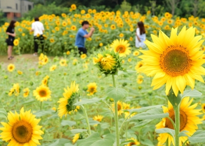 [충청뉴스큐] 수원 광교호수공원 제2주차장 옆에 꽃이 만개했다. 축구장 1.4배 넓이 부지가 황화코스모스, 코스모스, 해바라기로 뒤덮였다. 수원시가 조성한 ‘꽃빛단지’다.