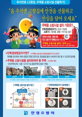 [충청뉴스큐] 안성소방서는 추석 명절을 맞아 오는 11일 오후 2시 전통시장, 대형마트, 터미널에서“고향집, 주택용 소방시설 선물하기”캠페인을 실시한다고 밝혔다.