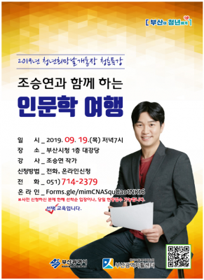 [충청뉴스큐] 부산시는 오는 19일 저녁 7시 시청 1층 대강당에서 청춘특강 ‘조승연과 함께 하는 인문학 여행’을 개최한다고 밝혔다.