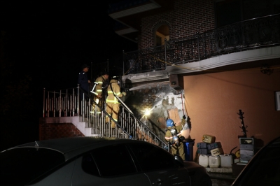 신고자 집주인 염모씨는 거실에서 TV를 시청 중 주방쪽에서 타는 냄새가 나서 확인해보니 집 밖 계단참 아래에서 불과 연기가 나고 있어서 밖으로 나와 남편 최모씨와 함께 자택에 있는 소화기를 사용하여 초기진화를 시도했다.