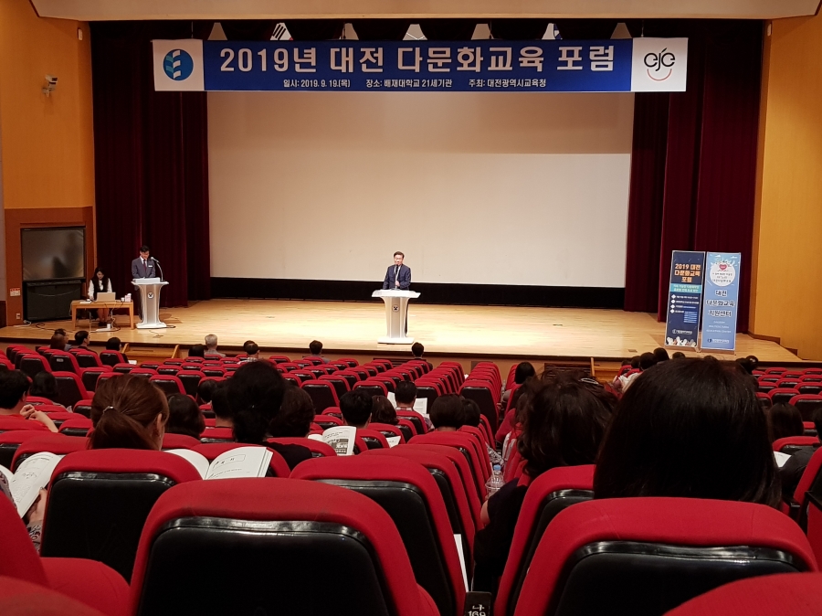 대전광역시교육청(교육감 설동호)은 19일, 배재대학교 21세기관 콘서트홀에서 다문화교육 정책학교 담당자, 다문화교육에 관심 있는 교직원 등 200여명이 참석한 가운데「2019년 대전 다문화교육 포럼」을 개최했다고 밝혔다. 대전교육청이 주최한 이번 포럼은 다문화교육의 미래교육 방향 설정을 위하여 교육공동체의 의견을 수렴하고, 발전적인 다문화교육 정책을 도출하기 위해 마련되었다. 포럼은 “지속가능한 다문화학생 글로벌 인재 양성 방안”이라는 주제로 대전전민초 최한나 학생의 이중언어 말하기를 시작으로 기조 발제와 주제발표 및 토크콘서트의 순서로 진행되었다. 먼저, 중앙다문화교육센터 서헌주센터장이‘다문화학생 글로벌 인재 육성: 왜, 무엇을, 어떻게 할 것인가?’라는 주제로 저출산, 고령화 사회에서 지속적으로 늘어가는 다문화학생을 미래 사회의 주요 성장동력으로 양성하기 위한 중장기 비전과 전략을 마련하자는 내용으로 기조 발제를 하였다. 이어서 진행된 주제발표에는 서울대학교 성상환 교수가‘다문화학생 인재육성을 위한 다문화교육 –이중언어교육을 중심으로’, 대전서구건강가정다문화가족지원센터 김정현 센터장의‘다양성(Diversity)을 가진 다문화학생 인재육성을 위한 지역사회 다문화교육’, 충남교육청 김영숙 장학사의‘2019 다름을 존중하는 공감과 참여의 충남 다우리 다문화교육’, 고양신일초 김인정 수석교사의‘학교 현장의 다문화교육을 말하다’, 끝으로 대덕초 맹재숙 교사의 ‘지속가능한 다문화학생 글로벌 인재 육성 방안’이라는 주제로 분야별, 지역별 다문화교육 관련 전문 패널들이 주제 발표를 하였다. 주제발표에 이어 대전서구건강가정다문화가족지원센터 김정현 센터장이 좌장을 맡아 토크콘서트를 진행하였으며, 기조 발제 및 주제발표를 한 5명의 패널이 함께 참여하여 지속가능한 다문화학생의 글로벌 인재 양성 방안에 대해 청중과 자유롭게 질의·응답 시간을 가졌다. 대전교육청 임창수 교육국장은 “다문화학생을 미래 우리 사회의 우수 인재로 양성하고자 발전적이고 변화하는 다문화교육의 방향을 제시한 본 포럼은 매우 의미가 있었다”며 “앞으로 미래의 다문화 교육환경의 변화 모습을 전망하고, 다문화교육 지원 강화에 지속적으로 노력해 나가겠다”고 말했다.
