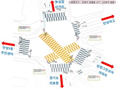 [충청뉴스큐] 안성시는 안전한 보행환경 조성과 보행자의 이동편의 증진을 위해 안성시 당왕동 477-22번지 일원 안성여고 앞 교차로에 대각선 횡단보도를 설치하여 오는 23일부터 운영한다고 밝혔다.