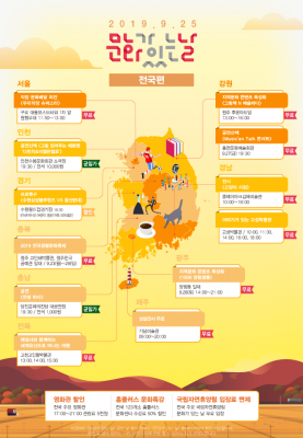 [충청뉴스큐] 매달 마지막 수요일은 국민들이 일상에서 문화를 더욱 쉽게 접할 수 있도록 하기 위해 문화체육관광부가 지정한 ‘문화가 있는 날’이다. 2019년 9월 ‘문화가 있는 날’과 해당 주간에는 전국에서 문화행사 2,511개가 국민들과 만날 예정이다.