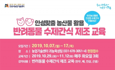 [충청뉴스큐] 안성시농업기술센터는 오는 10월 7일부터 17일까지 안성맞춤 농산물 활용 반려동물 수제간식 제조 교육생을 모집한다.