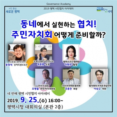 ‘동네에서 실현하는 협치 주민자치회 어떻게 준비할까?’라는 주제로 진행되는 이번 협치아카데미는, 평택시에서 ‘2020년도 평택시 주민자치회 전환 시범실시’를 위해 조례제정 등 본격적인 지원근거를 마련하고 있는 가운데, 실제운영을 위해 필요하다고 생각되는 쟁점들에 대해 다양한 의견을 교환하는 토론회 형식으로 열릴 예정이다.