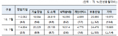 그 외에 전체 창업기업 중 높은 비중을 차지하는 도·소매업과 숙박·음식점업도 지난해 7월에 비해 각각 8.7%, 2.6% 증가해 꾸준한 증가세를 보이고 있다.