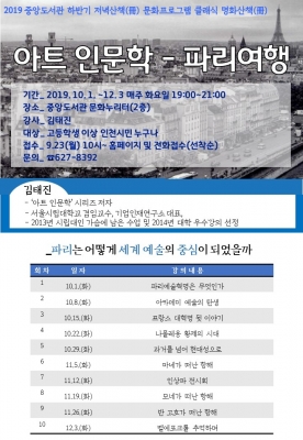 [충청뉴스큐] 인천광역시중앙도서관에서는 하반기 저녁산책 문화프그램 ‘클래식 명화산책’을 오는 10월 1일부터 12월 3일까지 매주 화요일 저녁7시, 중앙도서관 문화누리터에서 운영한다.