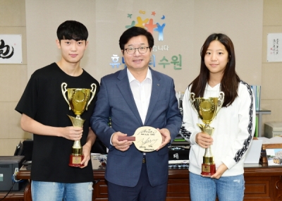 [충청뉴스큐] 염태영 수원시장이 2019 체코오픈국제탁구에서 혼합복식 우승을 차지한 신유빈·조대성 선수를 24일 집무실로 초청해 격려했다.