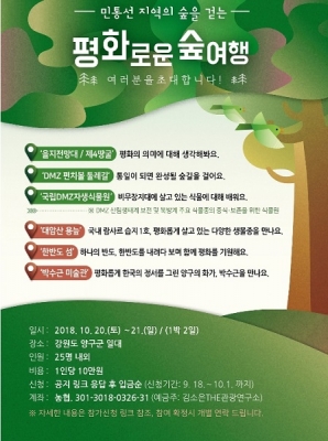 산림청은 오는 10월 20일부터 21일까지 1박 2일간 평화의 의미를 되새기며 통일이 되면 완성될 숲길을 따라 걷는 '평화로운 숲여행'을 진행한다고 18일 밝혔다.