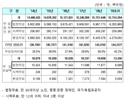 도시철도 무임승차 제도는 중앙정부 정책으로 1984년 시행해 2018년 전국 무임승차자는 4억 38만 명에 달하며 그에 따른 운임손실도 5,892억 원에 달하고 있다.