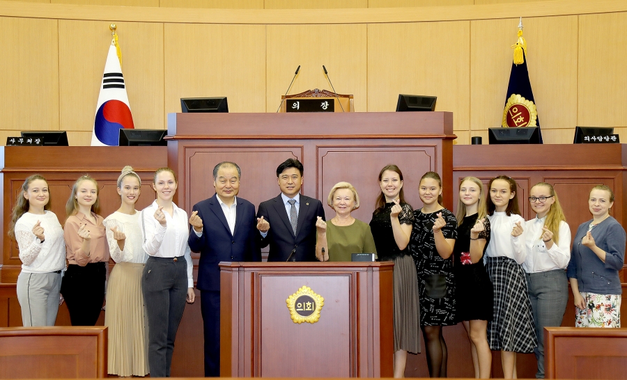 대전광역시의회 김종천 의장은 26일 러시아 국제민속무용단(단장 Shnitko Nataliia 씨니코 나탈리아) 일행을 접견하고 상호 우호관계와 협력 증진 방안에 대해 논의했다. 김종천 의장은 “러시아 노보시비리스크와는 2001년 자매결연을 체결한 이후 우호 관계를 이어 왔는데 이렇게 문화예술 교류를 하게되어 뜻깊게 생각한다”며 “문화예술분야 뿐만 아니라 다양한 분야에서 교류와 협력을 이어나가 소중한 인연과 우애를 더욱 돈독히 만들어 나가자”고 밝혔다. 또한 “올해부터 삼 년간 ‘대전 방문의 해’가 열리는 특별한 해에 우리 대전을 방문하신 만큼 앞으로 남은 일정도 좋은 추억 많이 만들어 조국에 돌아가 홍보를 많이 해달라”고 말했다. 이에 러시아 국제민속무용단 씨니코 나탈리아 단장은 “바쁜 일정에도 우리를 따뜻하게 환대해 줘 감사드린다”며 “집에 돌아가서도 오랫동안 기억에 남을 것이고 대전시 홍보에 앞장서겠다”고 화답했다. 한편 무용단 일행은 본회의장을 둘러보며 의회의 역할과 기능에 대한 설명을 듣는 등 직접 의회를 체험해 보는 시간도 가졌다.