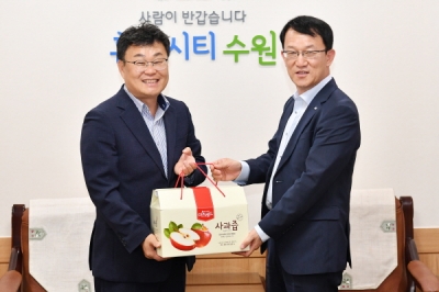 장영수 군수는 이날 조청식 수원시 제1부시장을 만나 고마운 마음을 전하고, 장수사과 사과즙을 선물했다.