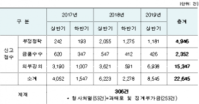 법 시행 이후부터 올해 상반기까지 각급 기관으로 접수된 위반신고는 총 22,645건이었으며, 유형별로는 부정청탁 4,946건, 금품수수 2,352건, 외부강의등 15,347건인 것으로 나타났다.