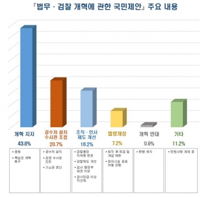 접수된 총 1303건의 국민제안은, ① 검찰개혁 ② 공수처 설치와 검경수사권 조정 ③ 검찰 조직과 인사제도 개선 ④ 전관예우와 피의사실 공표 금지 등의 의견이 주를 이루었다.