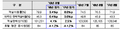 지표별로 살펴보면 객실이용률은 79.9%로 2018년 8월 대비 3.4%포인트, 2017년 8월 대비 8.0%포인트 상승했다. 외국인 판매객실비율도 46.3%로 2018년 8월 대비 0.4%포인트, 2017년 8월 대비 3.0%포인트 증가했다. 객실 판매단가는 131,251원으로 2018년 8월 대비 4.1%, 2017년 8월 대비 2.5% 상승했다. 객실 총매출액은 996억 원으로, 909억 원을 기록한 2018년 8월 대비 9.6%, 865억 원을 기록한 2017년 8월 대비 15.1% 증가해 전체적으로 호텔의 운영지표가 개선된 것으로 나타났다.
