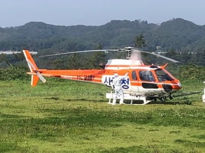 최근 경기 북부를 중심으로 확산하고 있는 아프리카 돼지열병 방역을 하기 위해 산림항공본부는 산림청 헬기 3대를 투입하여 경기도 연천군 임진강 일대에 약 368ha에 달하는 지역에 대해 항공방역을 실시했다.