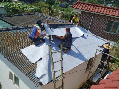 이날 주민자치위원들은 기좌리에 거주하는 장애인노인부부 가정을 방문하여, 지난 태풍 때 망가진 지붕에 직접 올라가 방수포를 까는 등 주거환경을 개선했다.