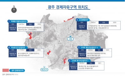 광주시는 5개 지구, 5.6㎢ 규모의 경제자유구역 지정을 통해 광주를 4차 산업혁명 시대에 인공지능 기반 융복합 산업 거점으로 조성하고, 지역 전략산업을 육성해 국내외 투자유치 촉진을 위한 혁신 성장의 서남권 거점으로 만들겠다는 계획이다.