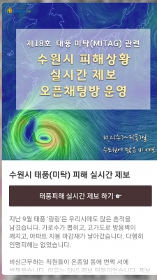 태풍 피해를 목격한 시민이 피해 사진과 상황 설명 등을 오픈채팅방에 전송하면 수원시는 신속하게 상황을 파악하고, 후속 조치를 해 추가 피해를 최소화할 예정이다. 오픈채팅방은 태풍주의보·경보가 해제될 때까지 운영한다.