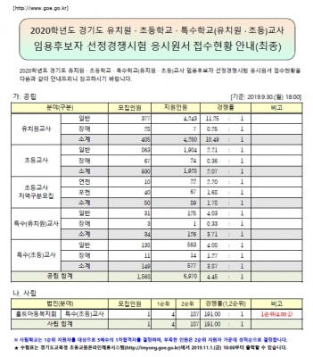 [충청뉴스큐] 경기도교육청이‘2020학년도 경기도 유치원·초등학교·특수학교교사 임용후보자 선정경쟁시험’원서접수 결과를 2일 발표했다.