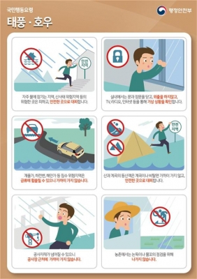 먼저, 강풍이 불 때는 지붕을 보수하거나 담벼락 근처에 가지 말고 실외활동과 외출을 자제하도록 하는 등 태풍 대비 국민행동요령을 적극 홍보토록 했다.