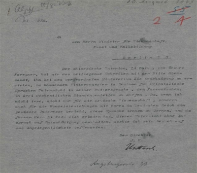 1923년 8월 10일 동양학부 발송 975호는 학장대리가 문교부 장관에게 한국어강좌 개설허가를 요청한 것이며, 같은 해 8월 31일 문교부 발송 8593호는 이를 허가한다는 내용이다. 이는 이극로의 요청으로 유럽 최초로 훔볼트대에 한국어강좌가 개설됐음을 입증하는 공문서다.