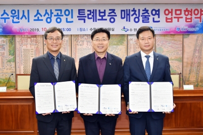 수원시·경기신용보증재단·기업은행은 7일 시청 상황실에서 ‘수원시 소상공인 특례보증 매칭출연 업무 협약’을 체결하고, 소상공인 육성에 적극적으로 협력하기로 했다.