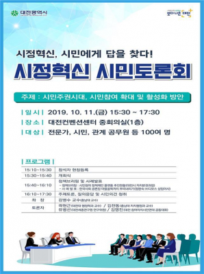 대전시는 오는 11일 오후 3시 30분 대전컨벤션센터 중회의실에서 2019년 시정혁신 시민토론회를 개최한다.