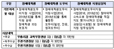 ‘장애대학생 도우미 지원 사업’은 장애를 가진 대학생의 학교생활을 돕거나 수화·속기 등과 같은 학습을 보조하는 활동을 수행하는 도우미를 지원하는 것으로 2005년부터 운영해왔다.