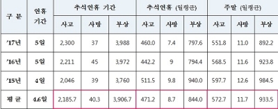 추석 연휴 기간 중 고속도로 일평균 사고는 교통사고 14.7건, 사상자 41.7명으로 평소 주말 보다 모두 증가했다.