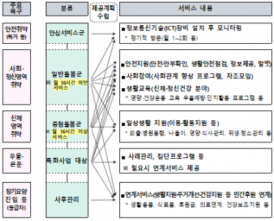 노인의 주요욕구에 따라 대상군을 분류하여 제공 가능한 서비스의 범위가 정해진 후, 개인별 돌봄필요에 따라 구체적인 서비스의 내용 및 서비스 양이 정해진다.