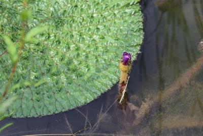 ‘가시연’은 수련과에 속하는 1년생 수초로 잎 지름이 최고 2m까지 자라 국내 자생 식물 중 가장 큰 크기를 자랑한다. 주름이 진 표면과 가시가 돋아나는 특색이 있는 모습을 하며 물이 고여 있는 늪지와 연못에서 자라며 자색의 꽃이 7∼8월에 핀다.