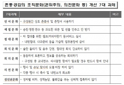 언어문화 예절문화 접대문화 회식문화 회의문화 의전문화 성인권문화의 조직문화 개선 7대 과제를 중심으로 구성원 간 상호 존중어 사용하기 선물 안주고 안받기 차 접대 셀프서비스 실시 회식 강요하지 않기 토론하는 회의문화 만들기 각종 행사에 성차별·비하발언, 성적농담하지 않기 등이 포함된 세부 내용을 전 기관이 적극 실천할 계획이다.