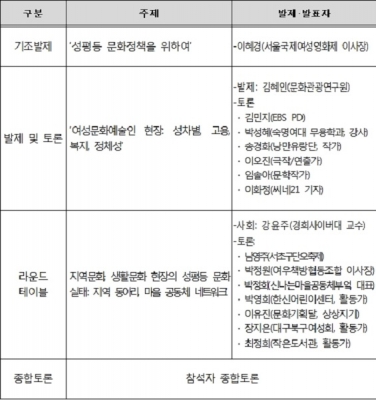 이혜경 서울국제여성영화제 이사장이 ‘성평등 문화정책을 위하여’란 주제로 기조발제를 하고, 박성혜 숙명여대 무용학과 강사, 김민지 한국교육방송 연출자 등 다양한 분야에서 활동하고 있는 문화예술인들이 현장에서 부딪치는 성차별과 고용·복지·정체성 문제에 대해 토론한다.