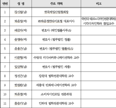 위촉된 위원들은 강신철 한국게임산업협회장, 박윤정 ㈜박윤정앤타이포랩 대표이사, 배금자 해인법률사무소 변호사, 송영숙 법무법인 정률 변호사, 윤용근 법무법인 엘플러스 변호사, 이문행 수원대 미디어커뮤니케이션학과 교수, 임상혁 법무법인 세종 변호사, 정진근 강원대 법학전문대학원 교수, 한창완 세종대 만화애니메이션학과 교수, 허유경 소비자시민모임 전문위원, 홍승기 인하대 법학전문대학원 교수 등이다.