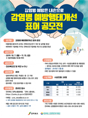 이에 따라, 전북도는 행태개선의 목적을 위한 포스터를 제작함에 있어 함축적인 표현 및 글귀에 대한 도민들의 창의적이며 재미있는 표현을 공모하고 채택된 표어를 활용한 포스터를 제작하여 감염병 예방 홍보를 강화하기 위해 이번 공모를 마련했다.