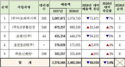 아모레퍼시픽, 엘지생활건강 등 매출액 규모 상위 5개 사업자 본사 및 소속 대리점의 2017년 매출액은 2조 3,765억원이었다.