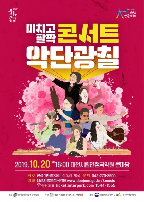 대전시립연정국악원은 문예회관과 함께하는 문화공감 사업으로 오는 20일 오후 4시 국악원 큰마당에서 악단광칠의 ‘미치고 팔짝 콘서트’를 개최한다.