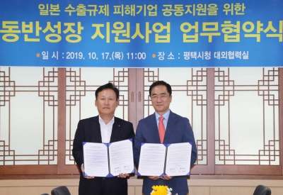 [충청뉴스큐] 평택시가 17일 시청 대외협력실에서 평택시와 IBK기업은행간 ‘일본 수출규제 피해 중소기업 지원을 위한 동반성장 지원사업 협약식’을 가졌다고 밝혔다.