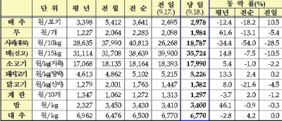 [충청뉴스큐] 여름철 폭염, 태풍·집중호우 등의 영향으로 8월까지 채소류·과일류 중심으로 수급 경색이 있었으나, 9월 들어 기상 호전, 수급안정 대책 효과 등으로 배추를 비롯한 주요 농산물 가격이 안정세로 돌아왔다.